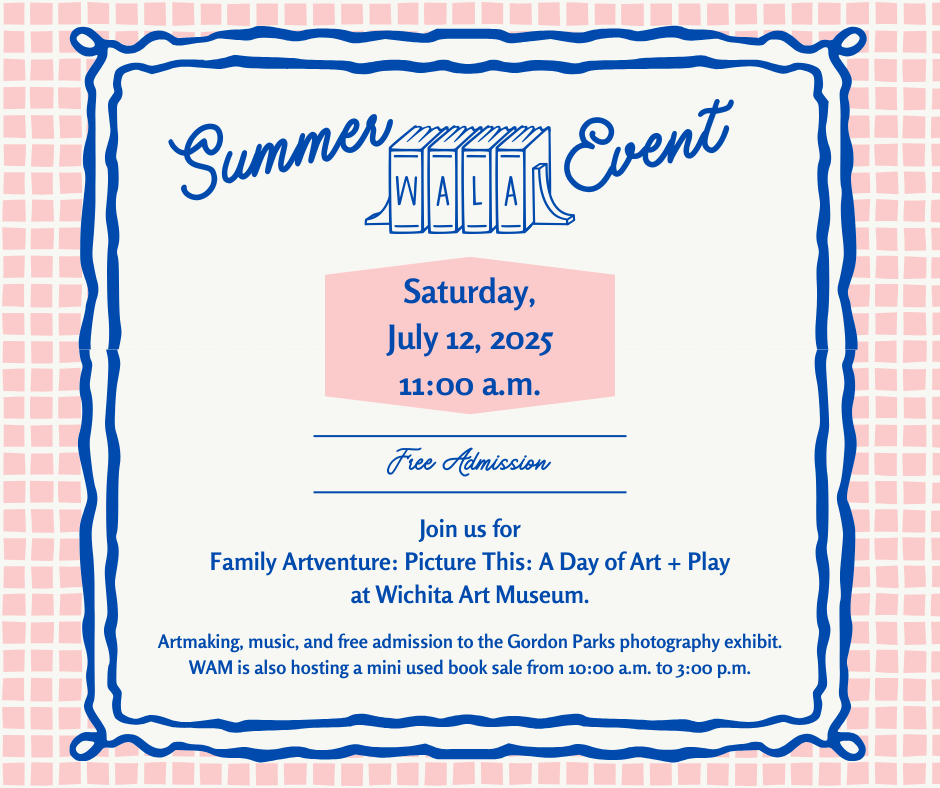 I’d love to see all your wonderful faces at the WALA summer event. We’ll meet up at the Wichita Art Museum on Saturday, July 12th at 11:00 a.m. for their FREE Family Artventure: Picture This: A Day of Art + Play. Enjoy artmaking, music, and free admission to the Gordan Parks photography exhibit. WAM is also hosting a mini used book sale the same day!